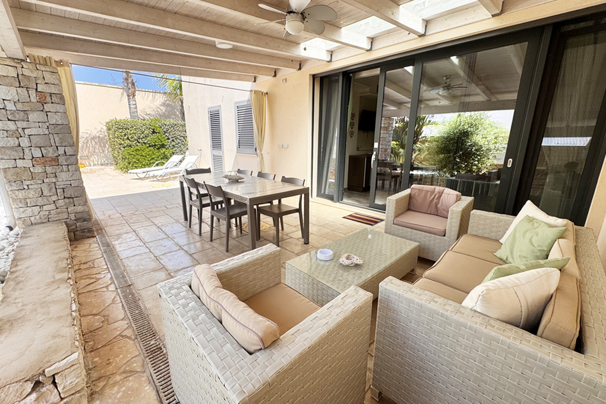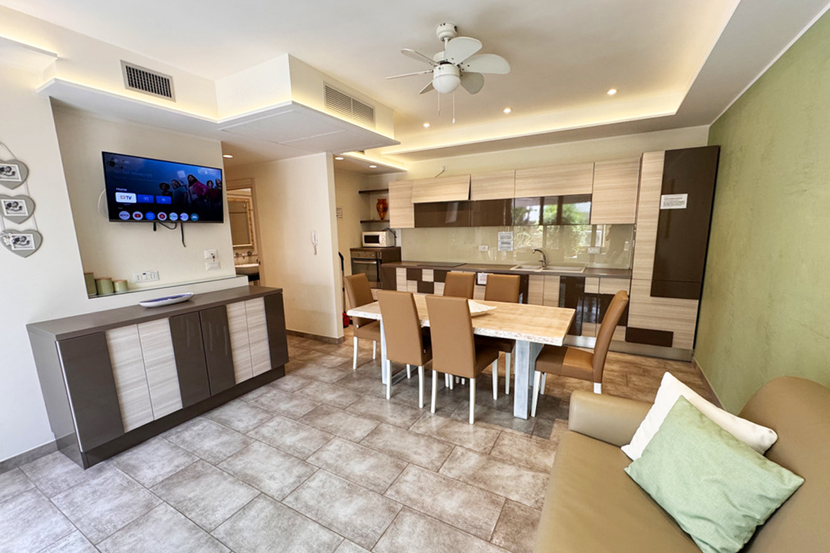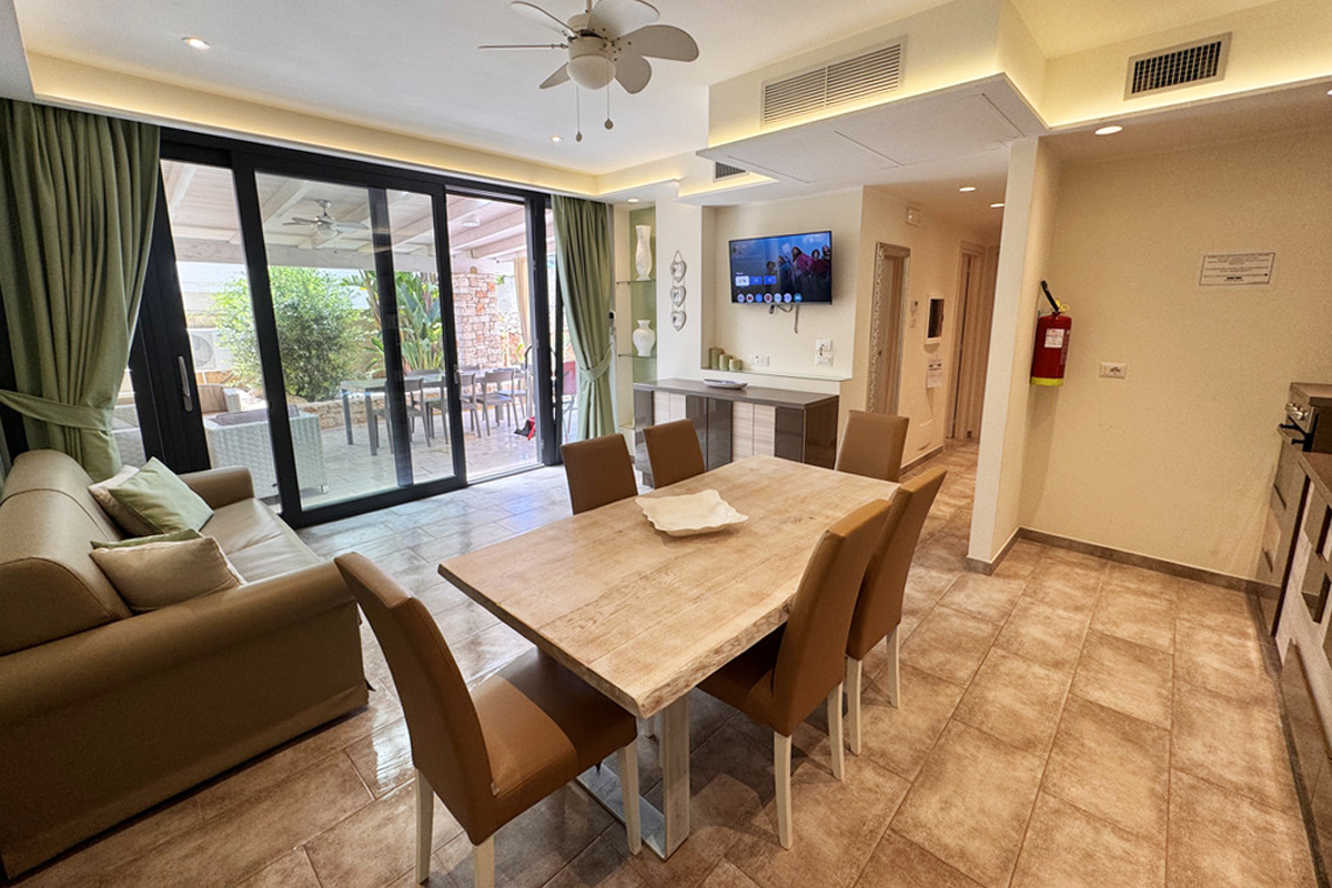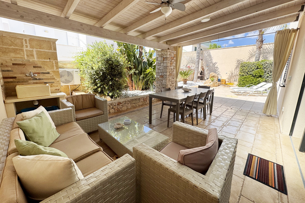 Se siete una famiglia con bambini e desiderate una casa a Pescoluse con giardino, questa è la soluzione che fa per voi. La casa è composta da ampia stanza da pranzo con divano letto, due camere da letto e due bagni. La cucina è totalmente attrezzata e la zona esterno è arredata con divanetti e sedie. La distanza dalla spiaggia è di 400mt. e questi consente di raggiungerlo a piedi.